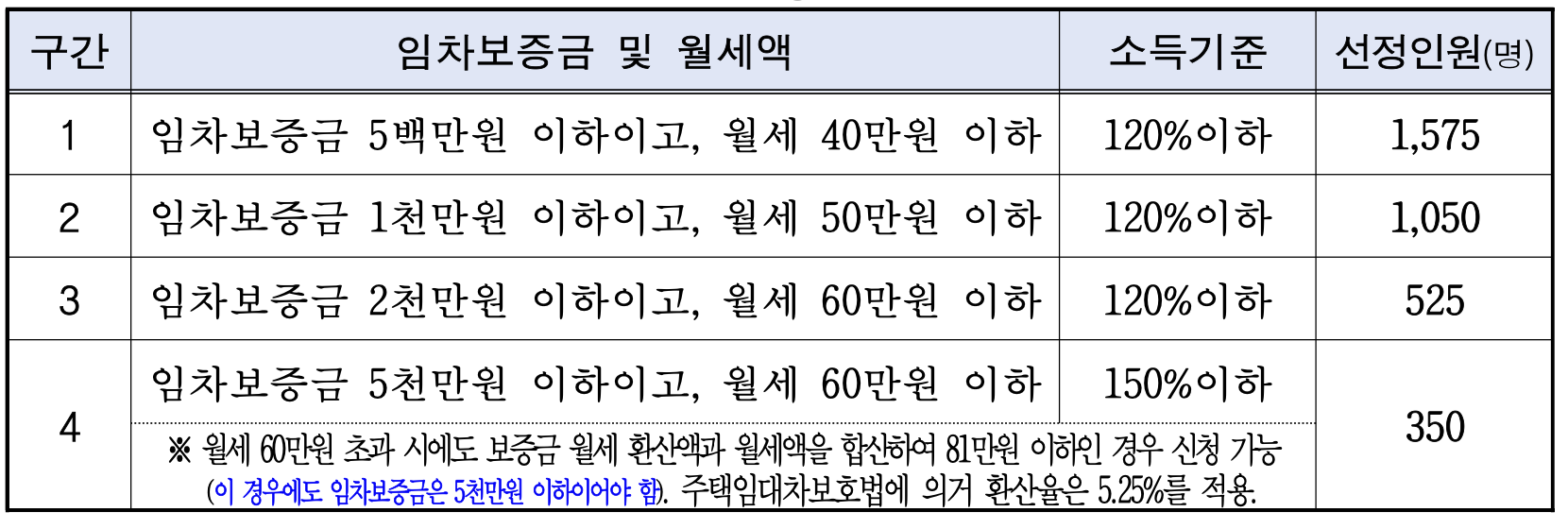 * 선정방법: 임차보증금·월세 및 소득 기준 4개 구간으로 나누어 선정하고 인원 초과 시 구간별 전산 추첨