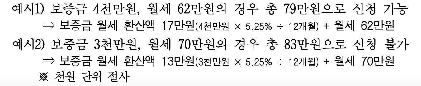 - 월세60만원초과시, 보증금월세환산액*과월세액합산81만원이하인경우신청가능