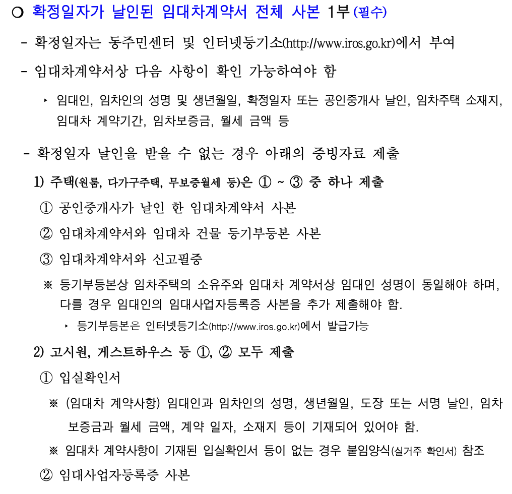 - 신청일 기준 임대차계약서상 임차건물 소재지에 주민등록(전입신고)이 등재된 임차인 본인이 신청해야 함.