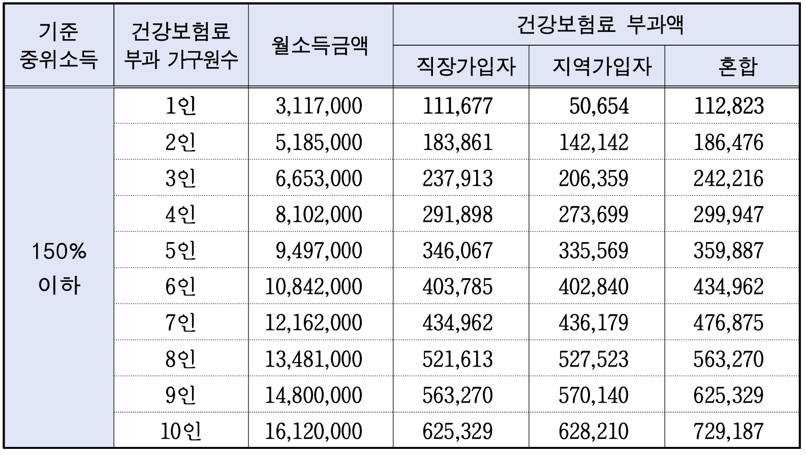- 신청인이 속한 가구의 건강보험료 부과액{최근 3개월(’23년 6월~8월) 평균액}이 ’23년 기준중위소득 150%의 건강보험료 부과액을 충족해야 함.